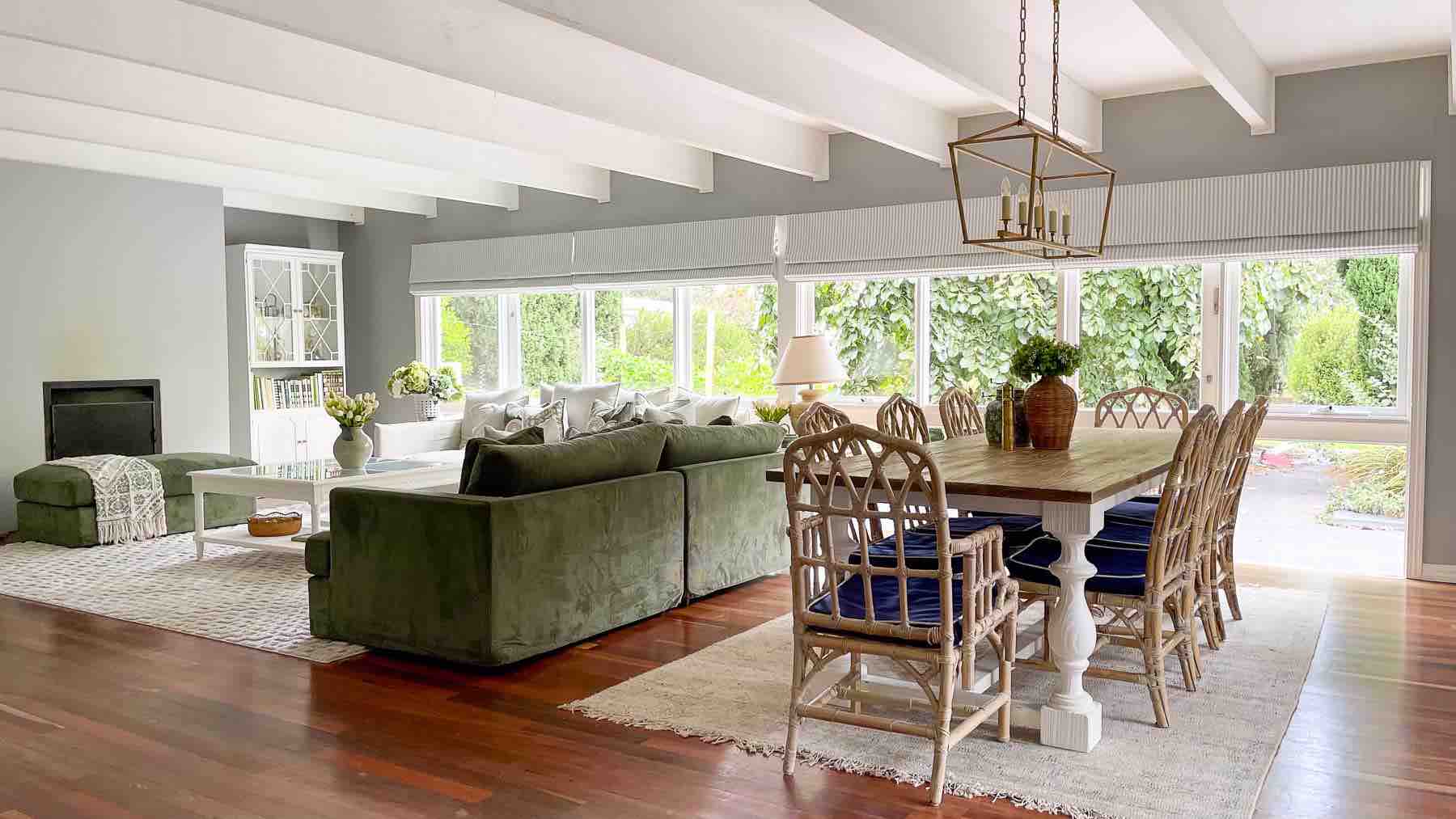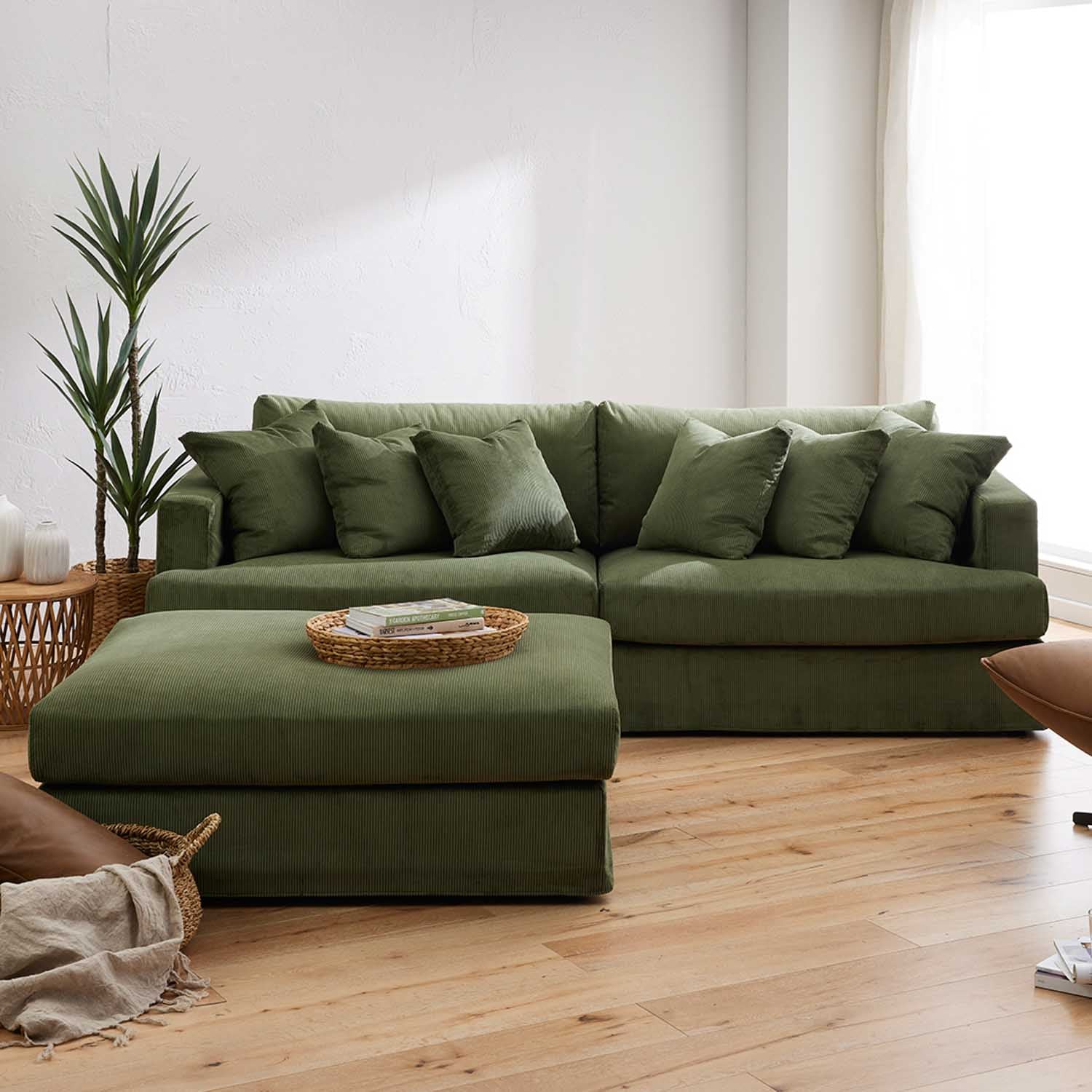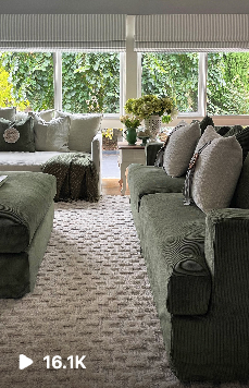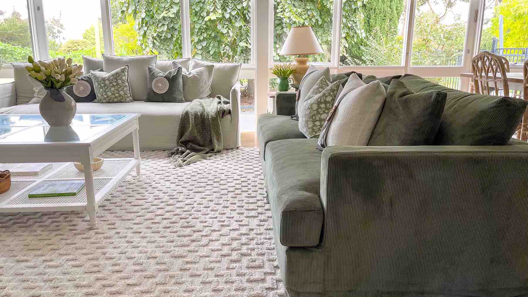 Emma chose the Janson 4 seat sofa in Encore Corduroy Forrest with ottomans. Janson products fit the beach/Hamptons style that Emma loves and creates content for. Emma loved the rich green texture of the Janson Forrest and knew it would be the statement she wanted to make in her living room.